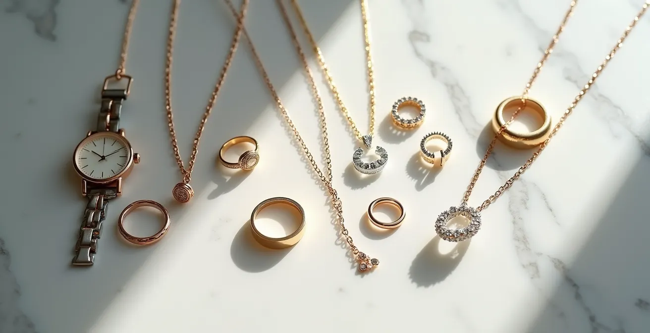 Empfehlung: Beginnen Sie mit dem Aufbau einer „Schmuck-Pyramide“, die eine solide Basis aus Alltagsstücken, einige Demi-Fine-Stücke und ein zentrales Investment-Stück umfasst.